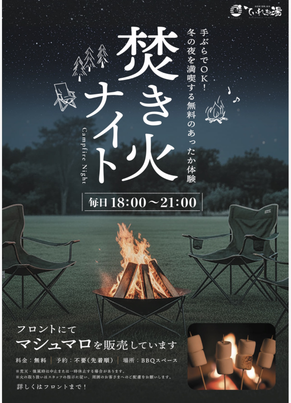 焚き火で冬の夜を楽しんだ後は温泉で身体をあたためてお帰りくださいませ